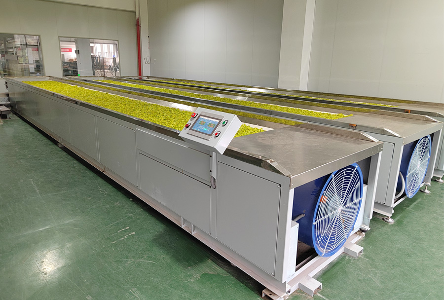 作業(yè)原理:單層式結(jié)構(gòu),機(jī)組采用的集中控制系統(tǒng)可精準(zhǔn)控制鼓風(fēng)時間、風(fēng)量、溫度、攤?cè)~厚度/重量等主要參數(shù),實現(xiàn)攤青(萎凋)的均勻充分。 利用光電定位系統(tǒng),能有效檢測茶葉流量,可自動控制茶葉進(jìn)入下一步工藝流程。